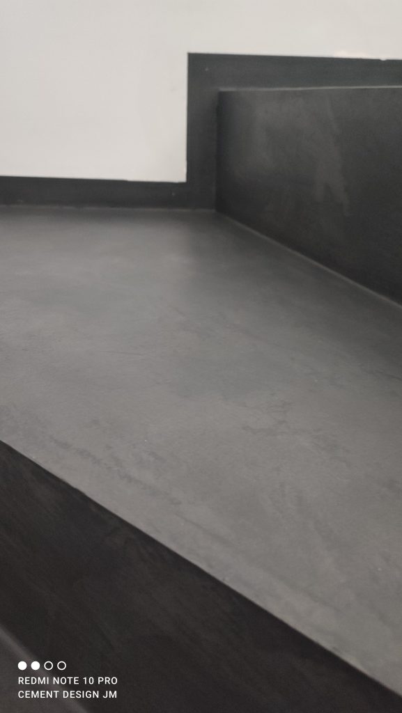 Zastosowany materiał w gotowej masie w kolorze, efekt betonstuc z zabezpieczeniem lakierem w optyce matowej
